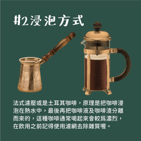 屬於浸泡方式萃取的咖啡有像是法式濾壓或是土耳其咖啡,原理是把咖啡浸泡在熱水中,最後再把咖啡液及咖啡渣分離而來的,這種咖啡通常喝起來會較為濃烈,在飲用之前記得使用濾網去除雜質喔。