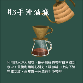 利用熱水沖入咖啡,把研磨好的咖啡粉萃取到水中,最後利用地心引力,讓咖啡由上向下流完成萃取,近年來十分流行手沖咖啡。