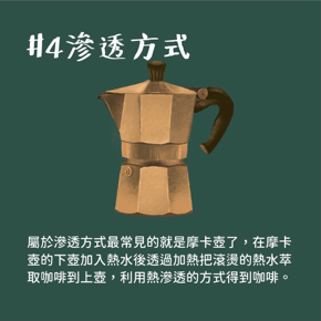 屬於滲透方式最常見的就是摩卡壺了,在摩卡壺的下壺加入熱水後透過加熱把滾燙的熱水萃取咖啡到上壺,利用熱滲透的方式得到咖啡。